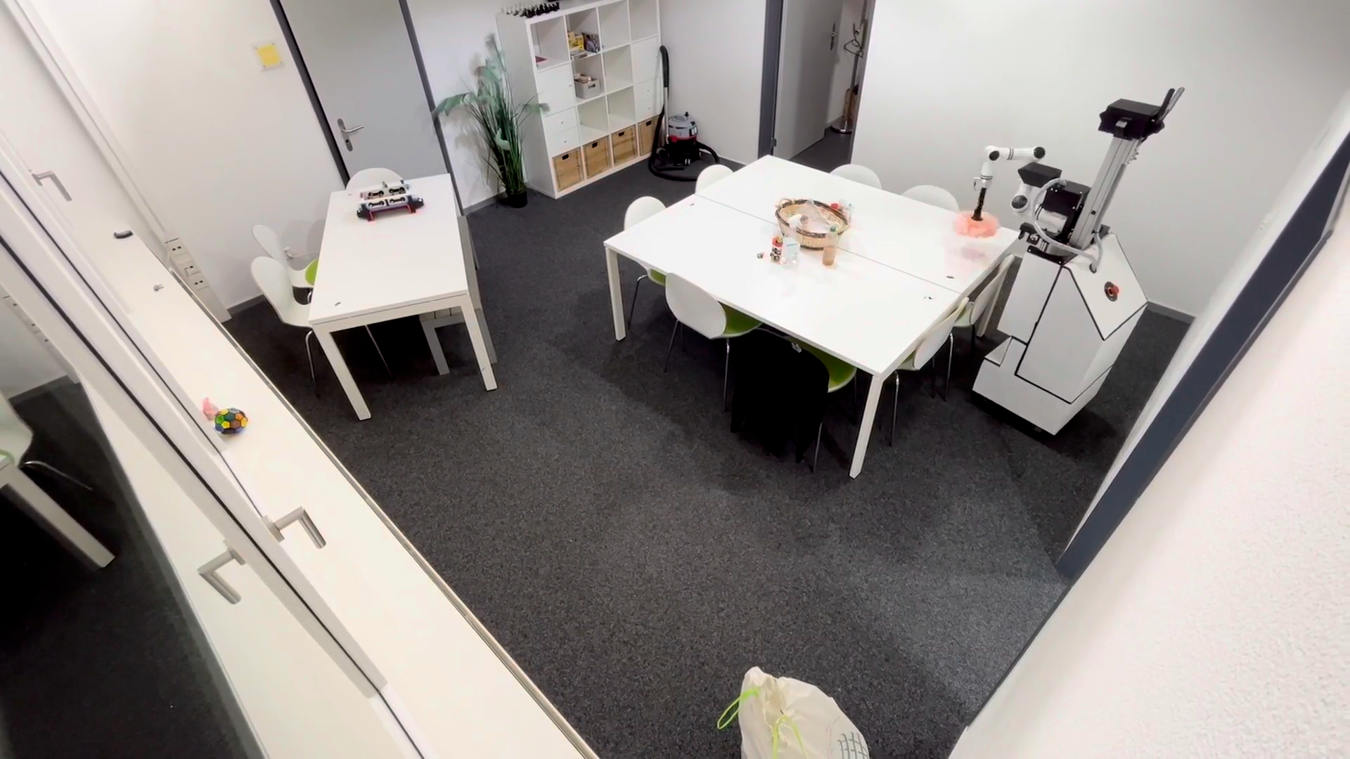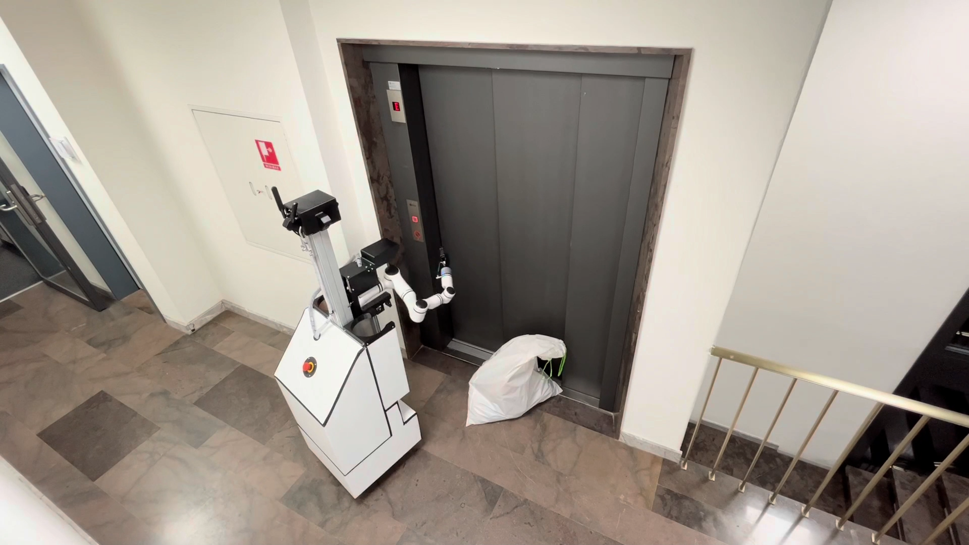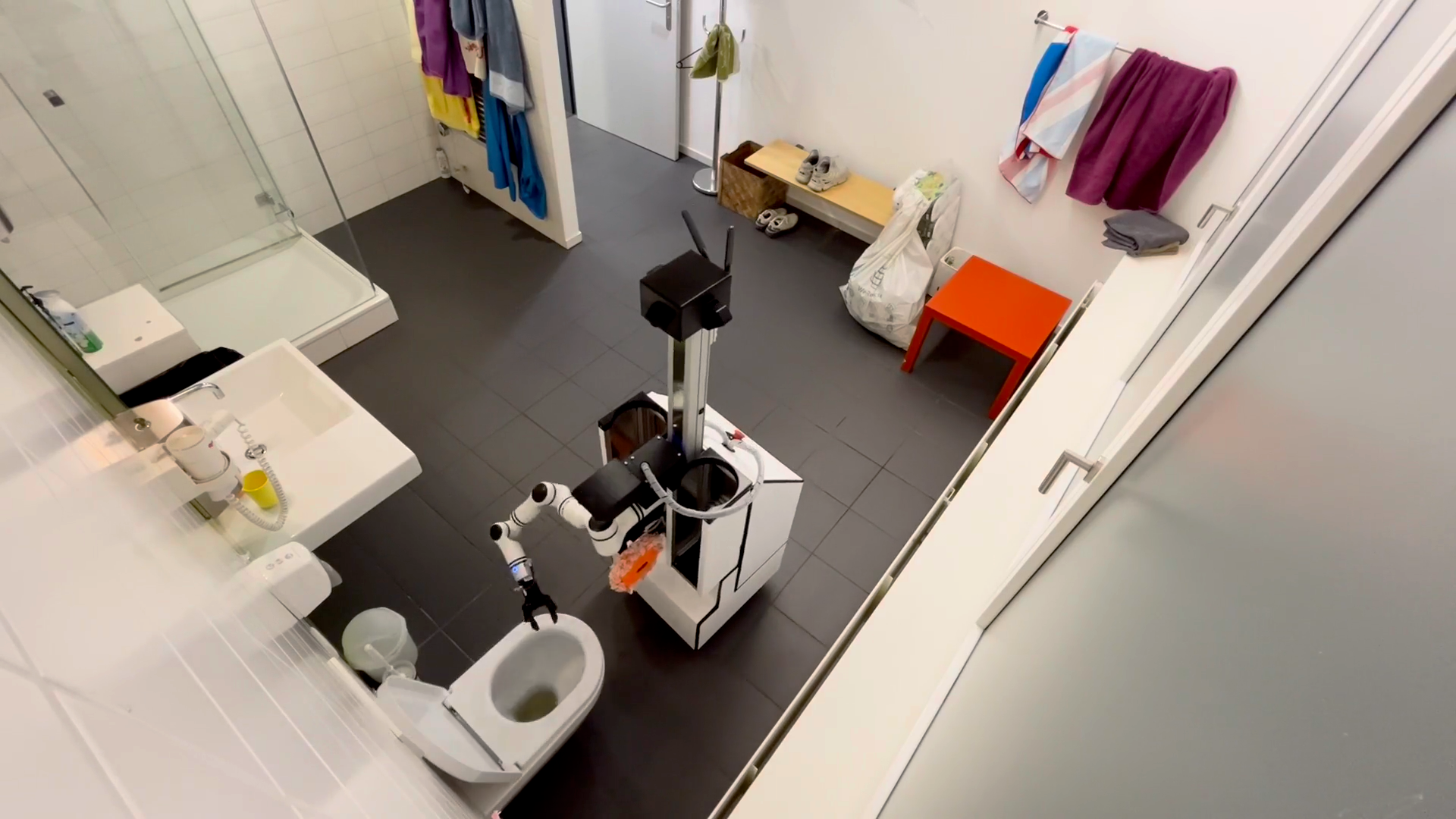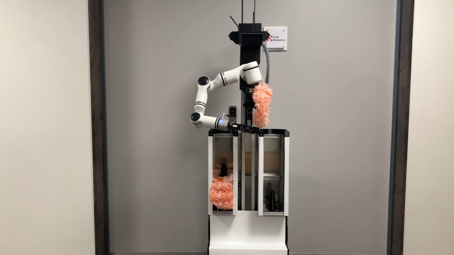 Loki is a single robotic arm mounted on a mobile base with two storage bins for cleaning supplies. It does not attempt to look like a humanoid; it borrows the useful parts of that form factor, compliant manipulation and multi-surface tool handling, while staying practical enough to fit in a commercial restroom stall. The physical intelligence is in the arm itself, which uses impedance-based inverse kinematics to sense how much force it is applying and adjust in real time, the same way a person moderates pressure when scrubbing a surface rather than applying fixed force regardless of what they encounter.